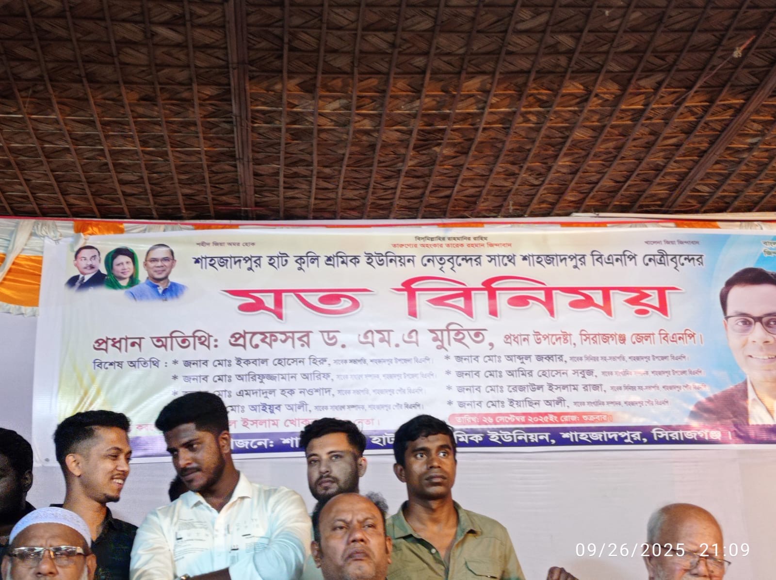 সিরাজগঞ্জের শাহজাদপুর পৌর সদরে অবস্থিত দারিয়াপুর হাটে ২৬ সেপ্টেম্বর শুক্রবার রাতে, শাহজাদপুর কুলি শ্রমিক ইউনিয়ন নেতৃবৃন্দের সাথে শাহজাদপুর উপজেলা বিএনপি নেতৃবৃন্দের সঙ্গে মতবিনিময় সভা অনুষ্ঠিত হয়েছে।